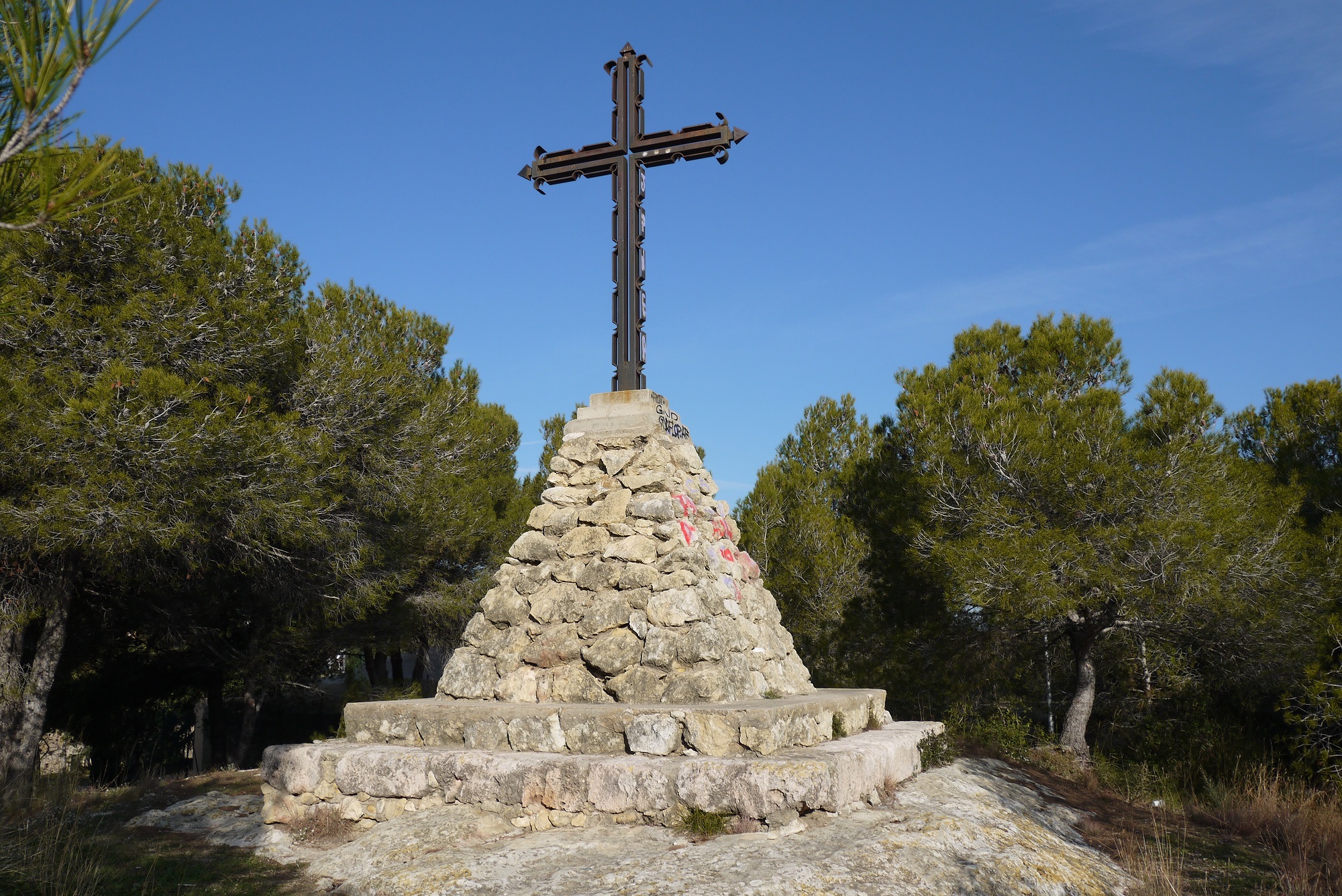 El local social de nuestra penya es el Hotel d'entitas del Parc del Comunidó. Nuestro recorrido comienza aquí. A pocos metros hay una pequeño promontorio. Allí hay una cruz....